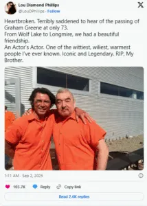 “Rip Graham Greene. I had the honor of working with him on @rezdogsfx. I spent long van rides with him to set he was always cracking everyone up, including me, he was lighthearted, wise, hilarious, I’m tearing up as I write this. I spent little time with him but it felt like I knew him lifetimes. He felt so familiar probably from seeing all his films growing up. He lived the way you should. With a light heart. No ego. Not jaded. Interested. Graham thanks for everything. Truly. You made an impact on so many people’s lives. You’ll be missed. Much love.”