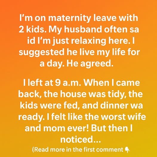 I’m on maternity leave with two kids. My husband often said I was “just relaxing at home,” as though my days were simple. One evening, after yet another remark, I suggested he live my life for a day. To my surprise, he agreed. The next morning, I left at 9 a.m. with nothing but my handbag, telling him I’d be back by evening. A part of me expected chaos when I returned. But when I walked through the door later that day, I was stunned.