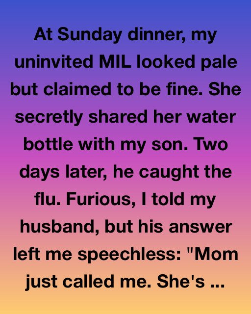 At Sunday dinner, my uninvited MIL looked pale but claimed to be fine. She secretly shared her water bottle with my son. Two days later, he caught the flu. Furious, I told my husband, but his answer left me speechless: “Mom just called me. She’s in the hospital.”