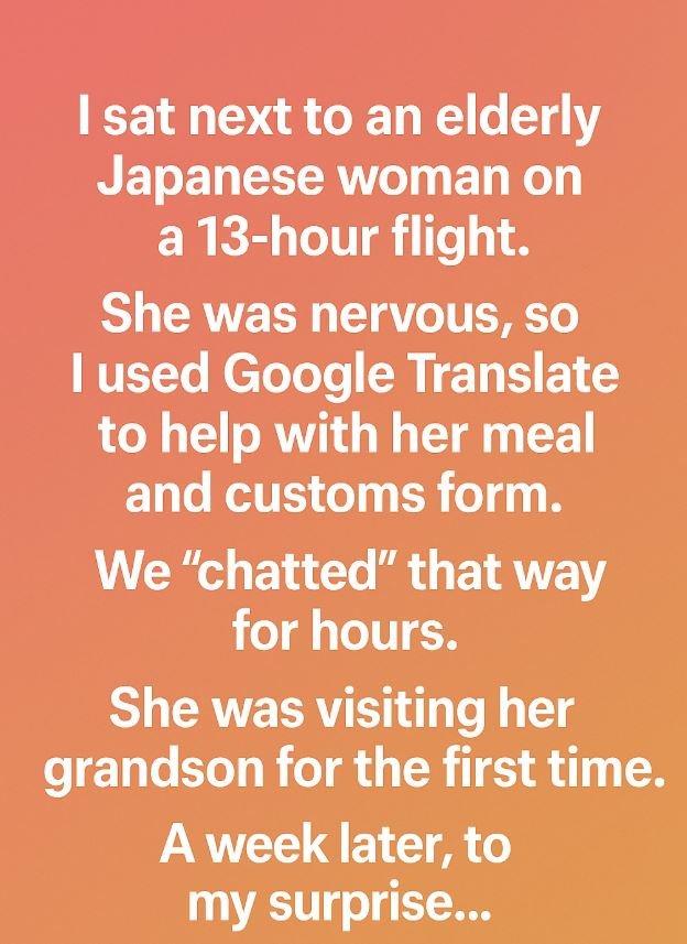 A week later, I got a message on social media from her grandson. He had found me online and wrote: “My grandmother said you were her angel on the flight. She wants to thank you properly. Please come to dinner with us.” That evening, I sat around their table, surrounded by food, laughter, and warmth. What began as a seat assignment on a long flight turned into a friendship that reminded me how kindness can bridge any language, culture, or distance.